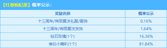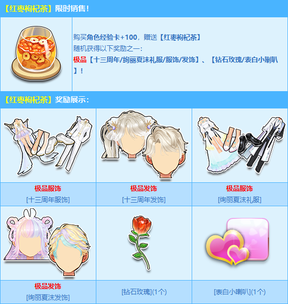 10月5日-11月9日,购买角色经验卡+100,赠送【红枣枸杞茶】,随机获得以下奖励之一:极品【十三周年/绚丽夏沫礼服/服饰/发饰】、【钻石玫瑰/表白小喇叭】!